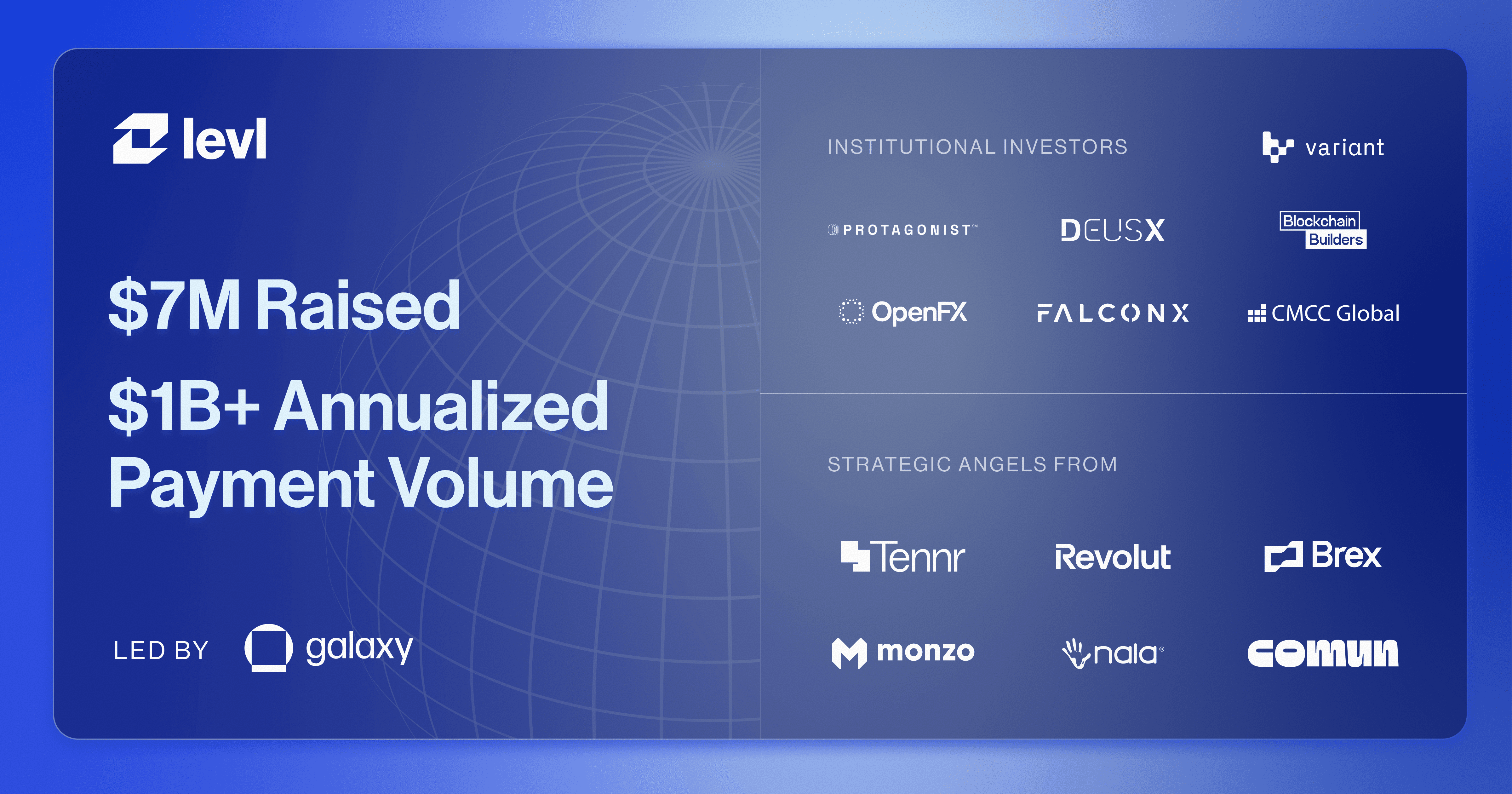 We're building momentum. Today, we announced the closing of a $7 million seed funding round led by Galaxy Ventures with participation from Protagonist, Deus X, Blockchain Builders Fund, OpenFX, FalconX, CMCC, Variant Fund, and a strategic angel network including leaders from Revolut, Brex, Comun and many other leading fintechs.